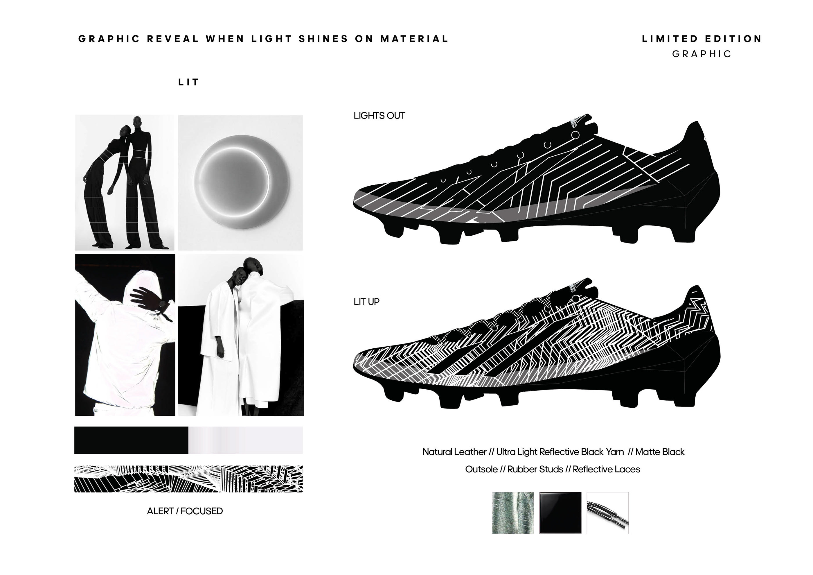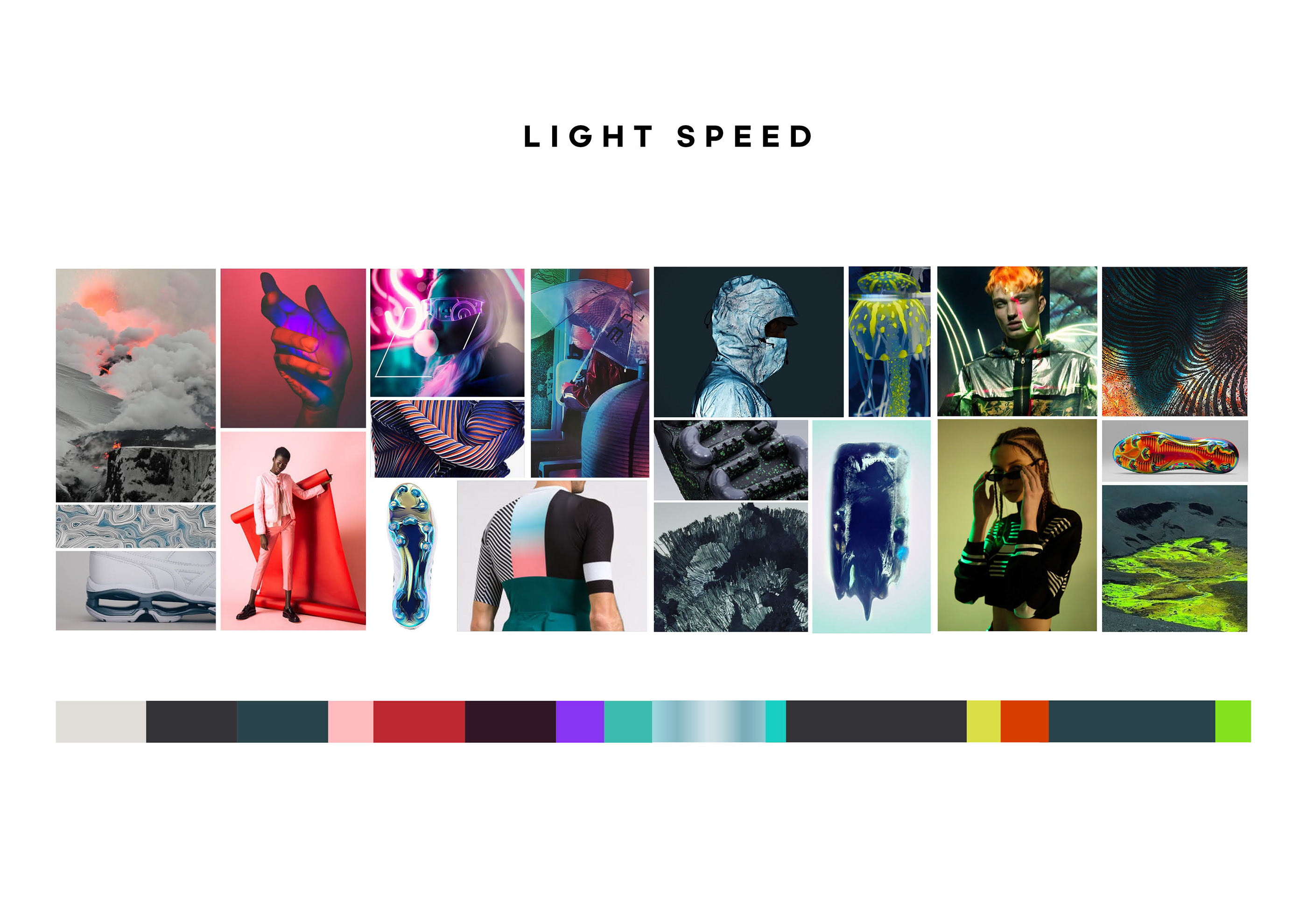 LIGHT SPEED, as a color story defines lightweight appearances through transparencies, fluro accents and reflective layers. This indicated that the materials have a lightweight appeal, through the use of tinted and transparent tpu skins, light reflective finishes and engineered knits and woven's for high performance percision. In football its important that material concept is lightweight so the players can be fast on their feet and reach their maximum speed before their opponents.