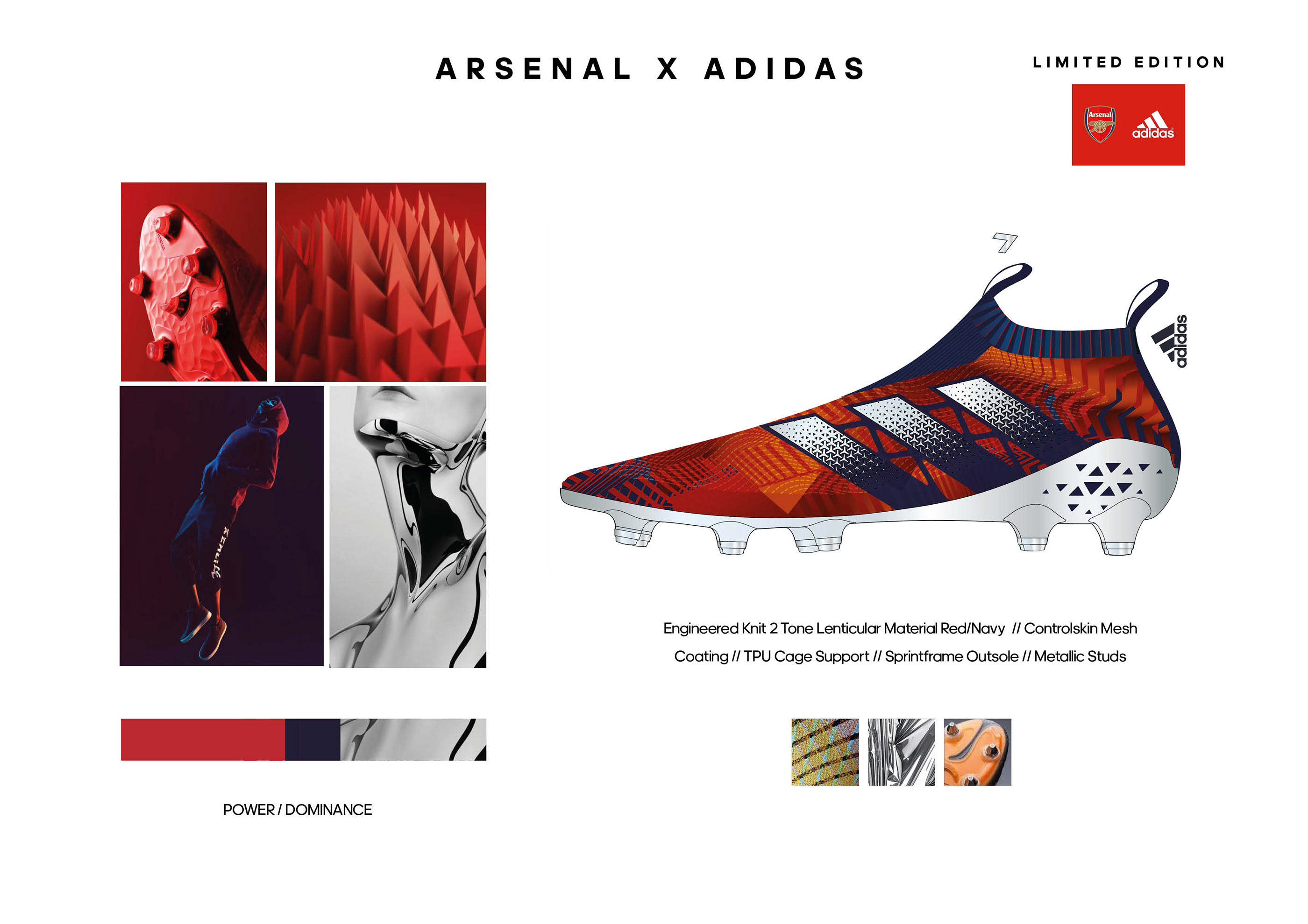 Lenticular knits engineered to create a color shift within the knit to show the speed and agility through the material when in play. Red / Navy / Smooth metallic silver define Power and Dominance of the game. A sleek smooth metallic silver tooling gives the impression that ‘hes as fast as ice’