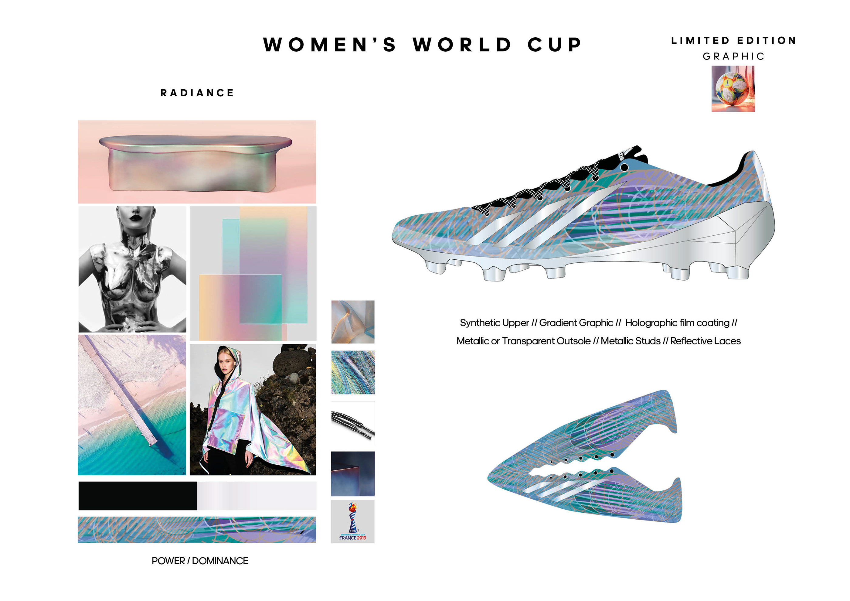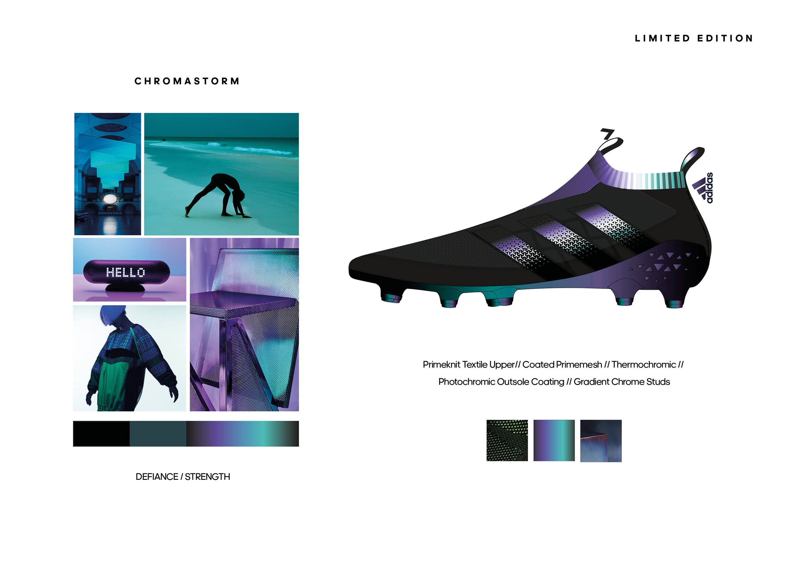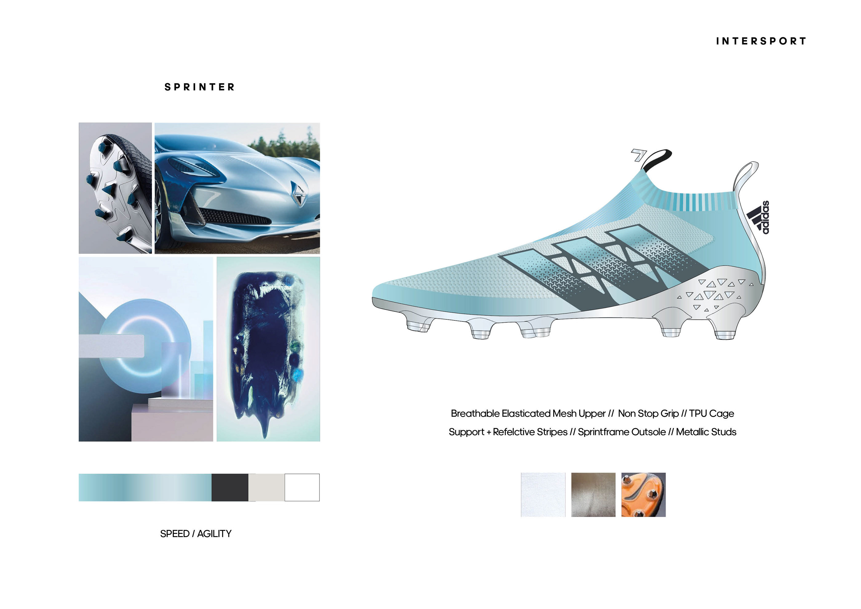 A personal project for Adidas Football CMF team, to create and color and material story for 2 limited edition boots and along with 2 limited edition graphics. As well as 2 commercial colourways for Intersport.