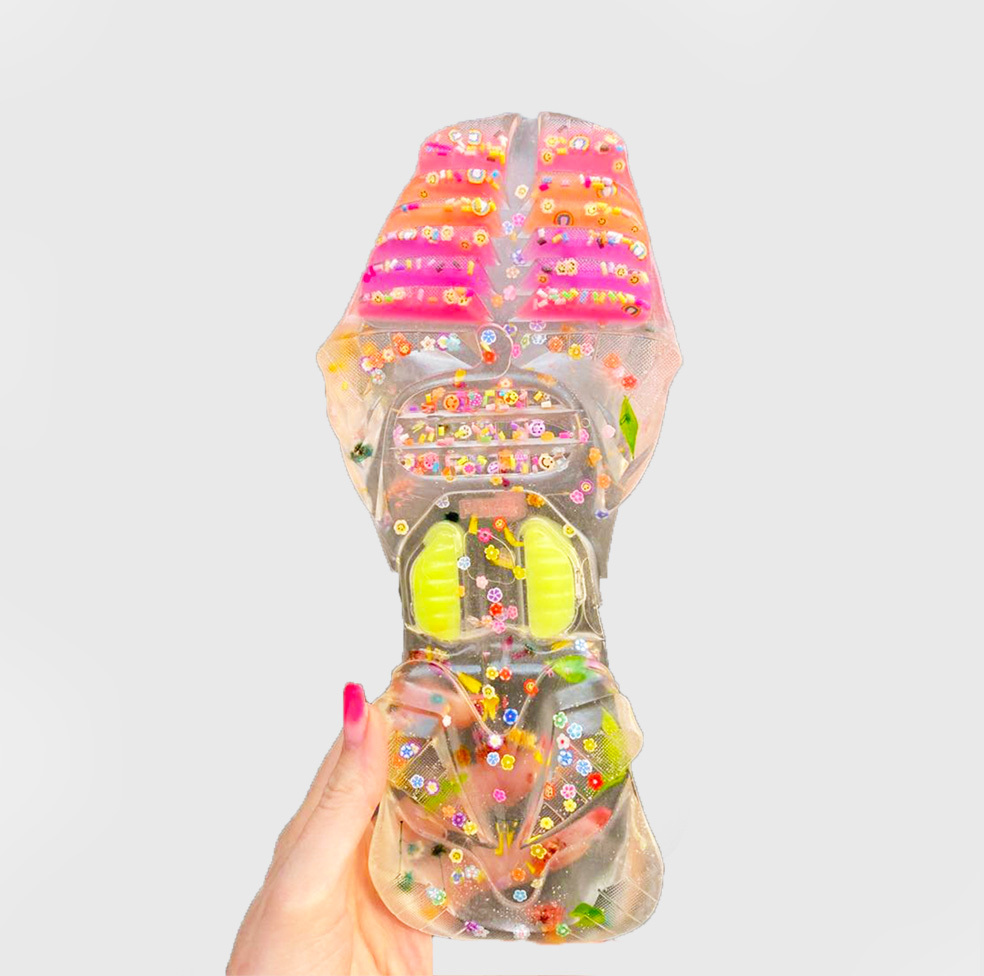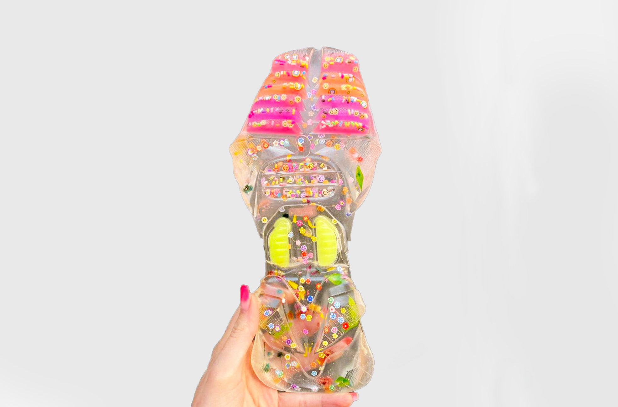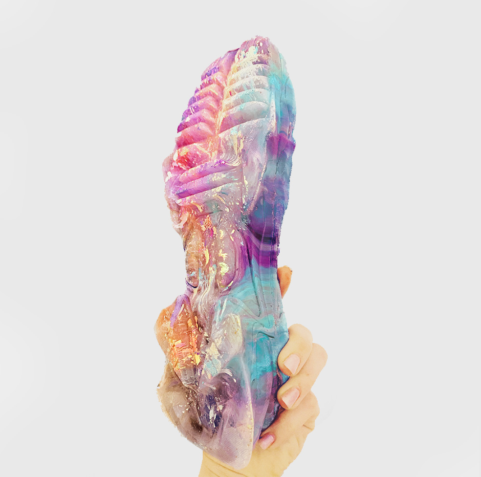The outcome was unreal—a galactic swirl of purples, pinks, and blues danced across the surface, seamlessly transitioning through the top layer. It draws you in, mesmerizing with its dynamic shifts. And then there’s the sole: colors exploding and cascading downward with a frosted tint that adds a layer of mystery and intrigue.